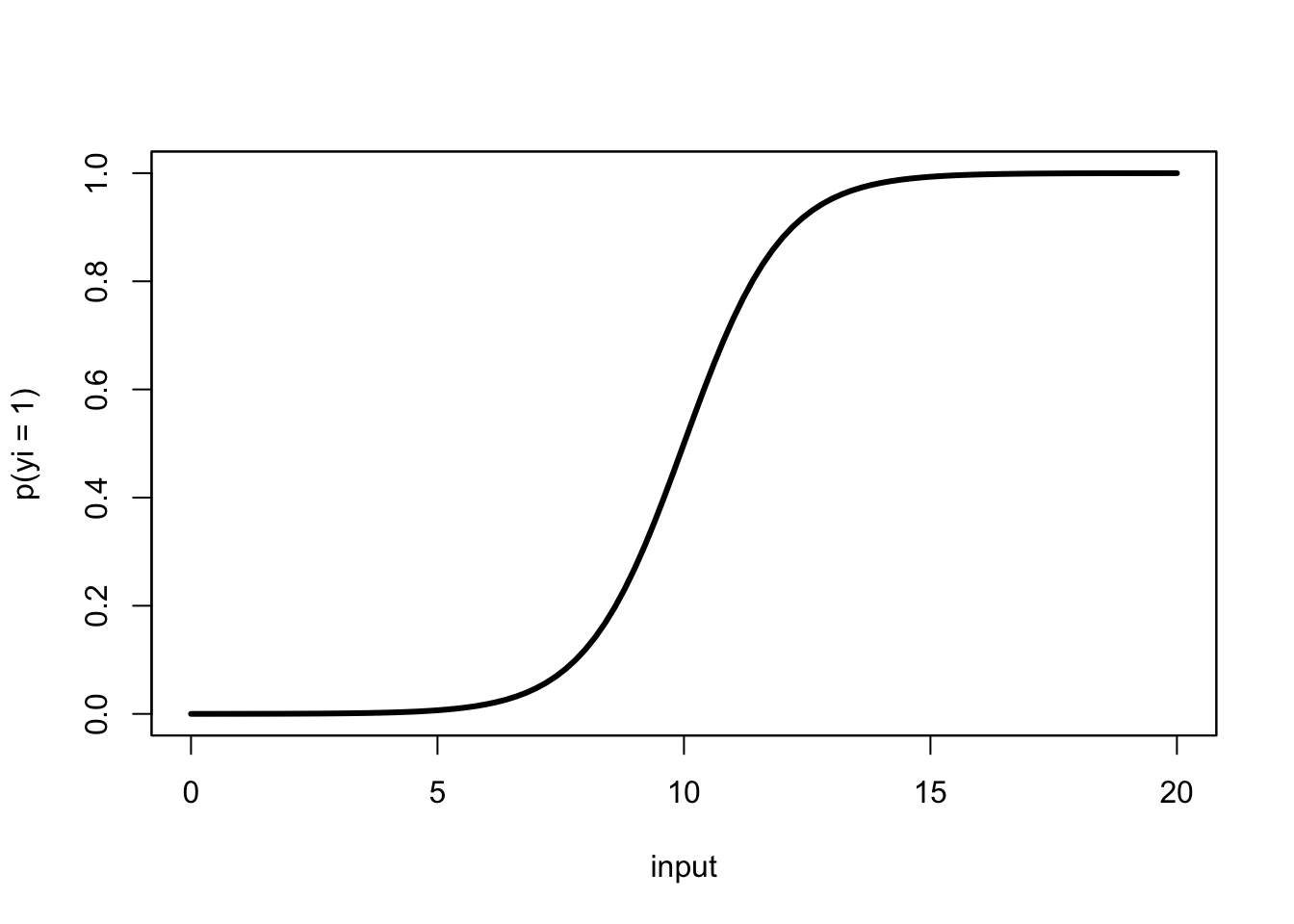 \[ p(y_i = 1) = \frac{1}{1+\text{exp}({- \sum \beta_i x_i })}, \] whose output is in \((0,1)\) (a probability).