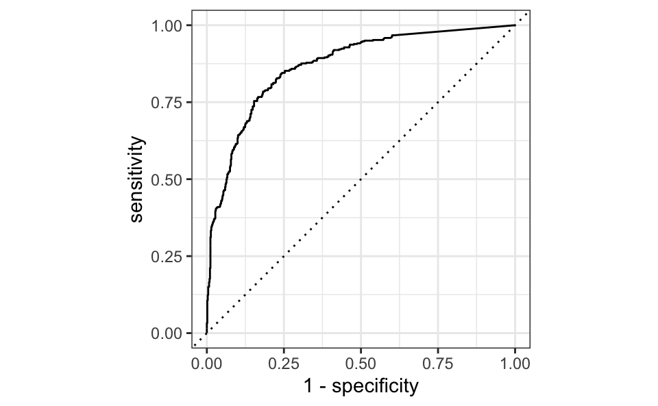 Receiver operating characteristic (ROC) curve+ plot true positive rate vs. false positive rate (1 - specificity).