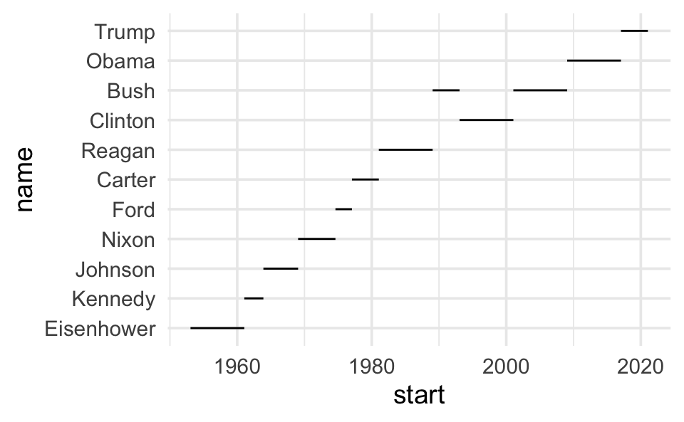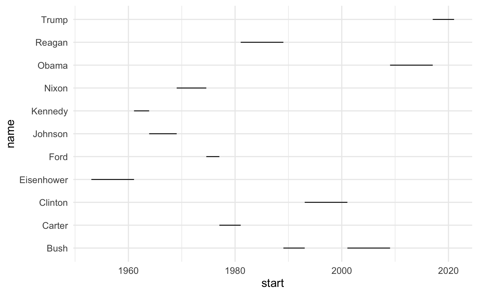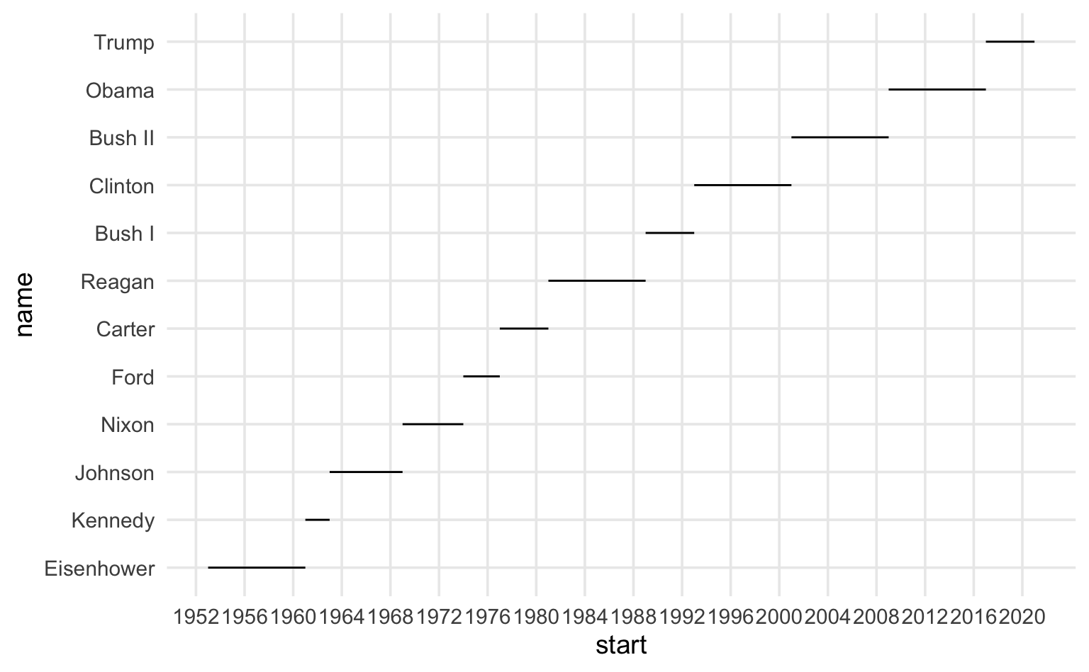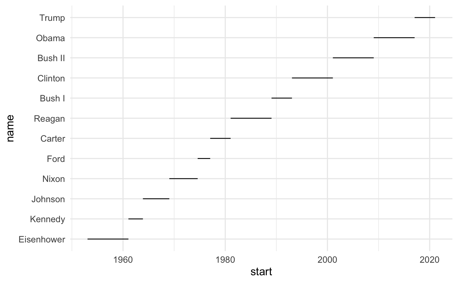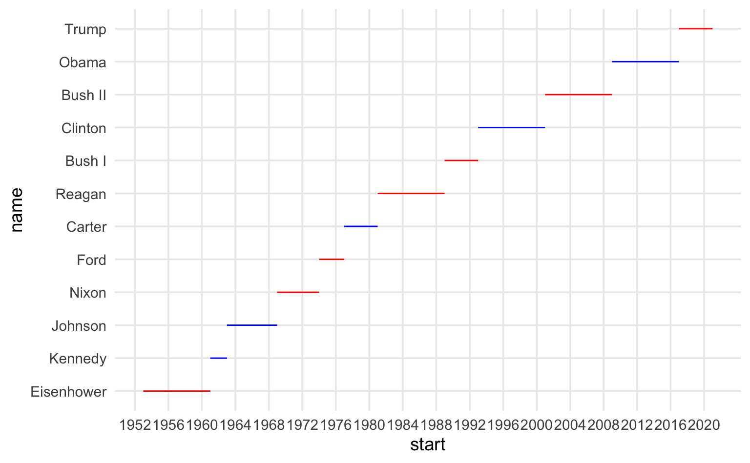 aes(x = start, xend = end, y = name, yend = name, color = party)